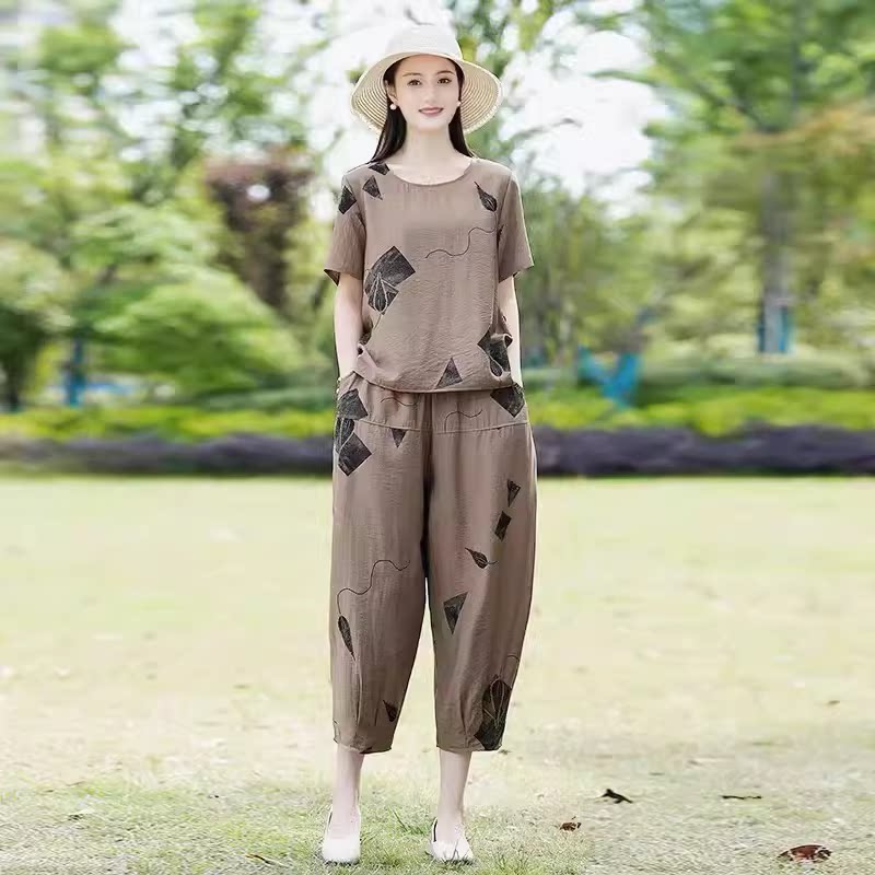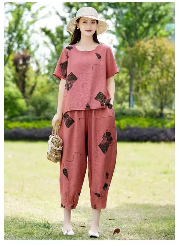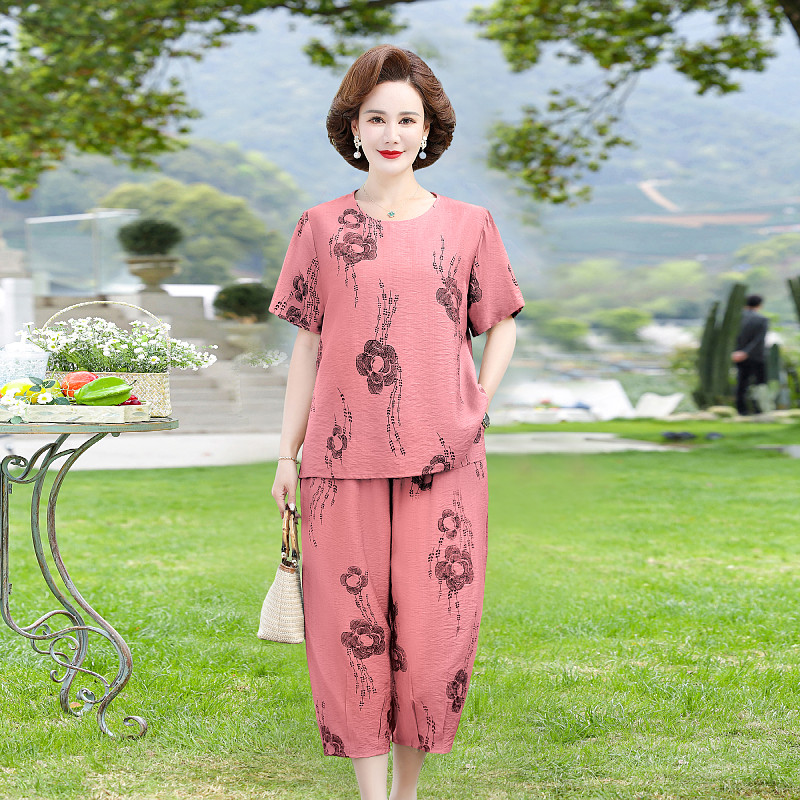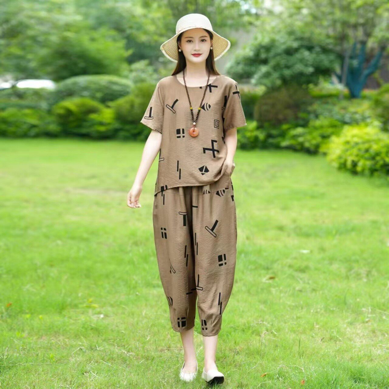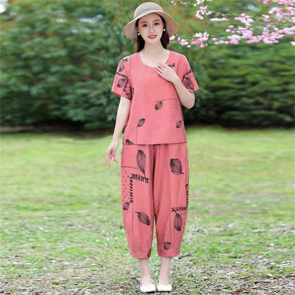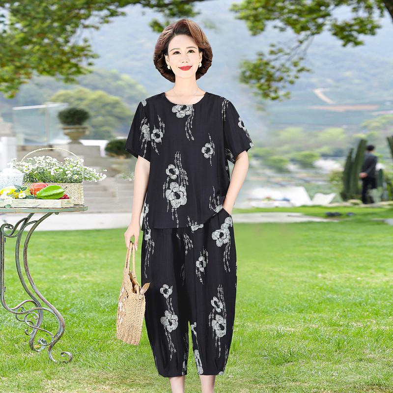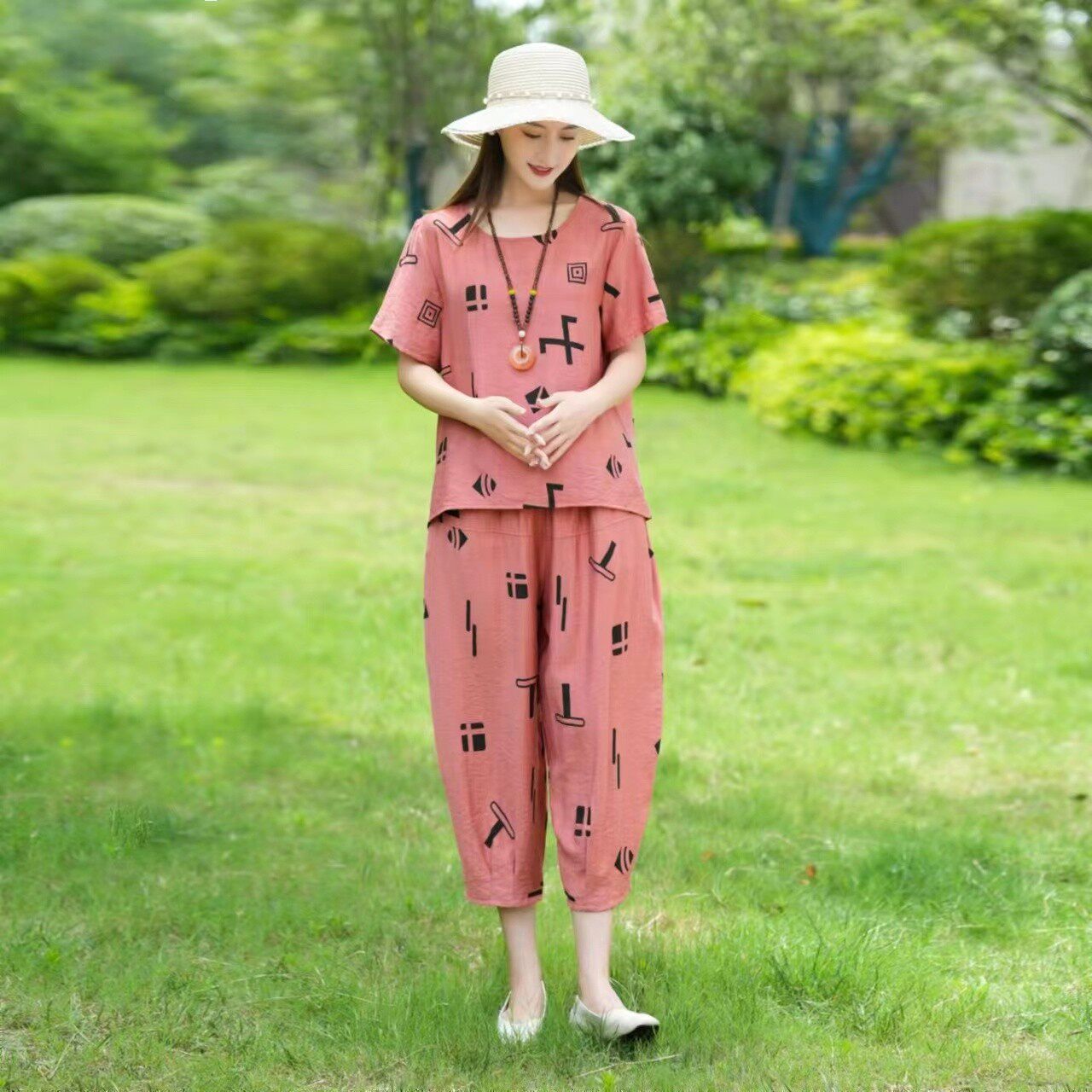 冰丝棉麻套装女中年妈妈夏装2026新款短袖中老年人大码休闲两件套