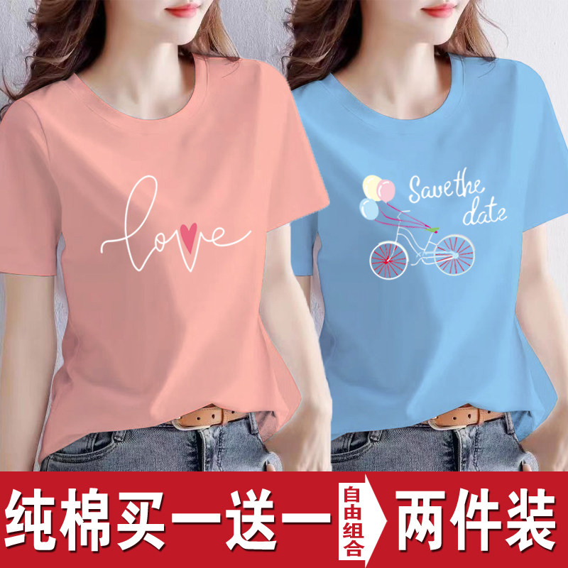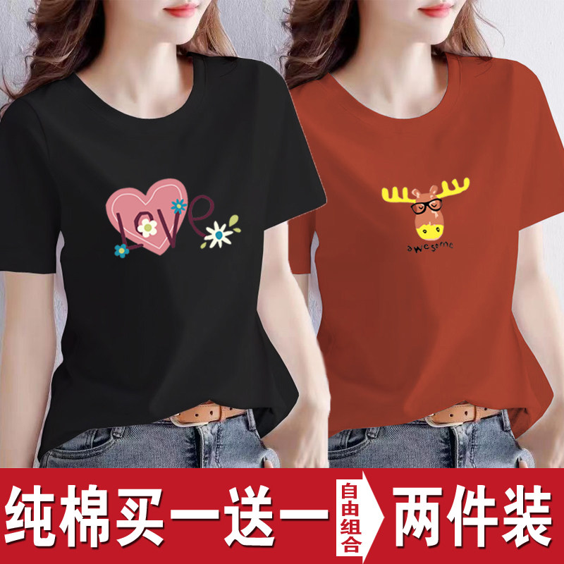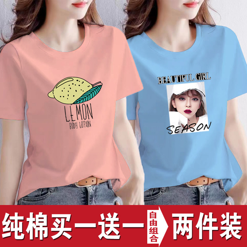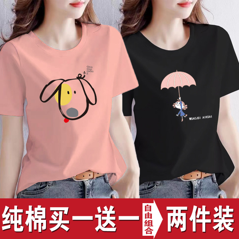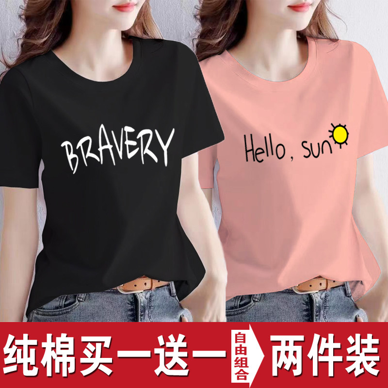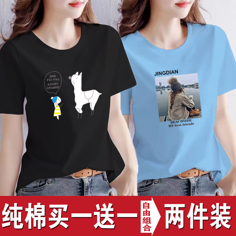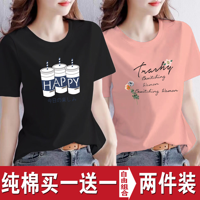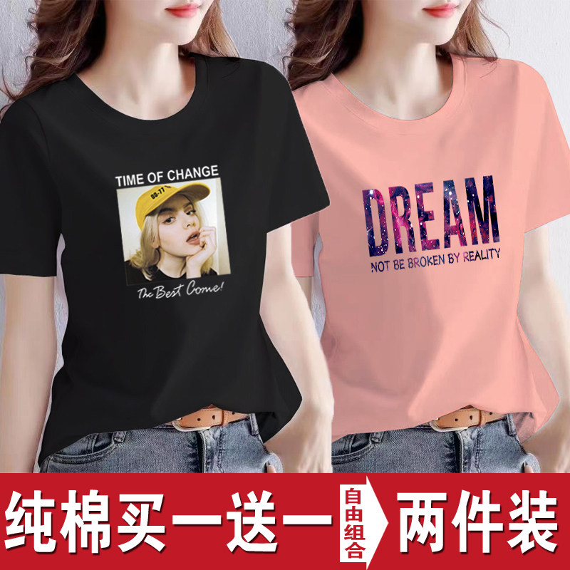 买一送一纯棉韩版印花短袖t恤女时尚宽松潮流时尚大码新款打底衫