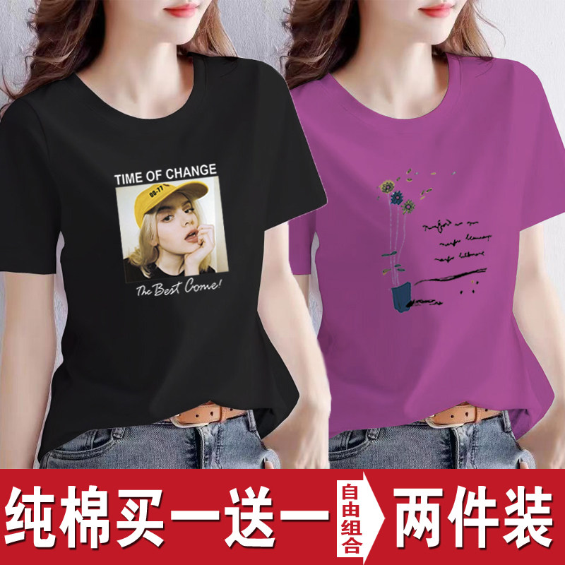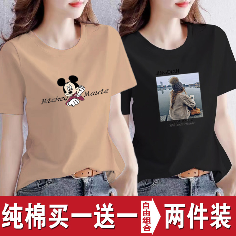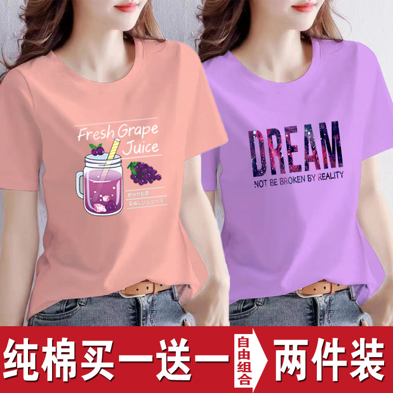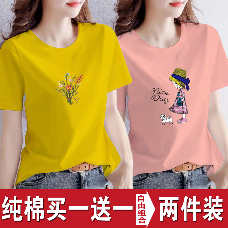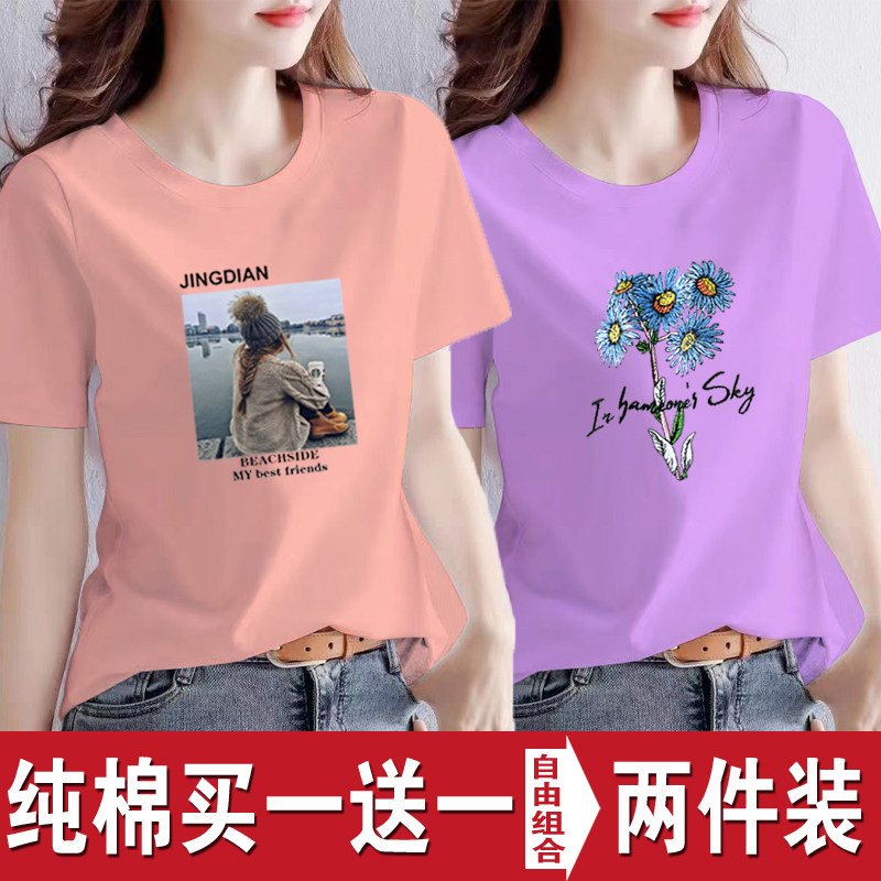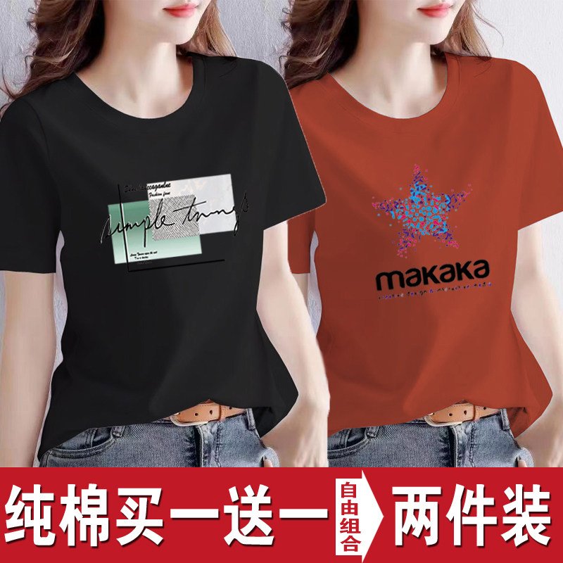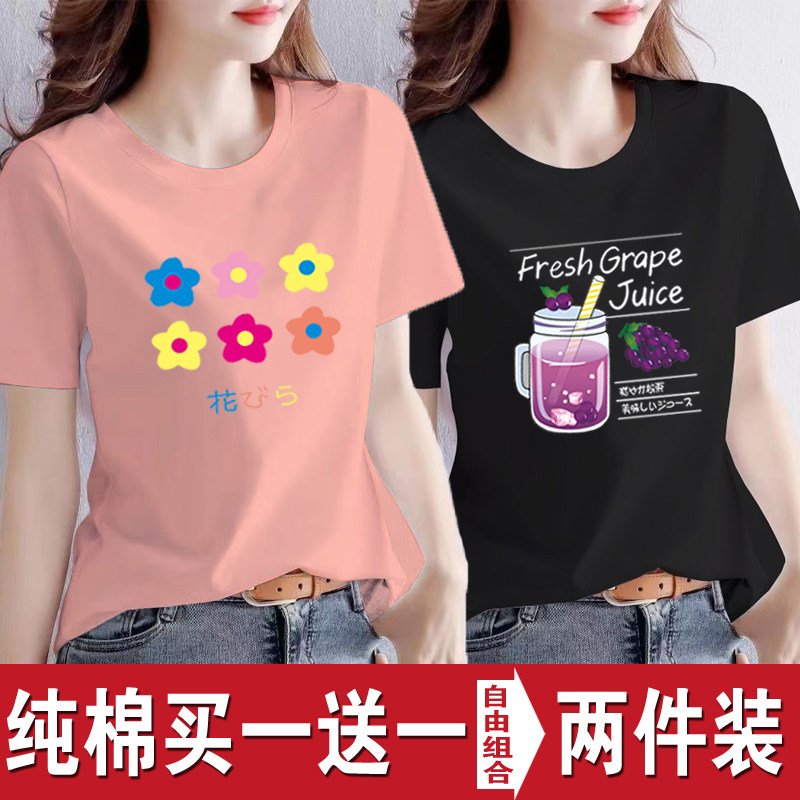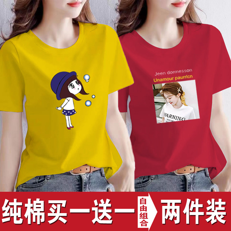 买一送一纯棉韩版印花短袖t恤女时尚宽松潮流时尚大码新款打底衫