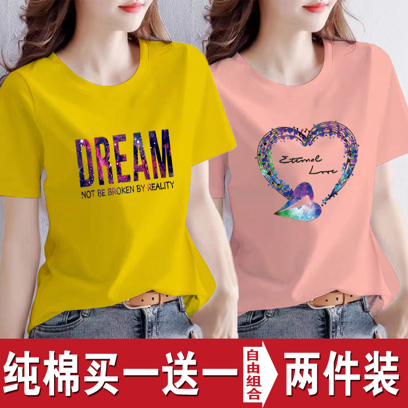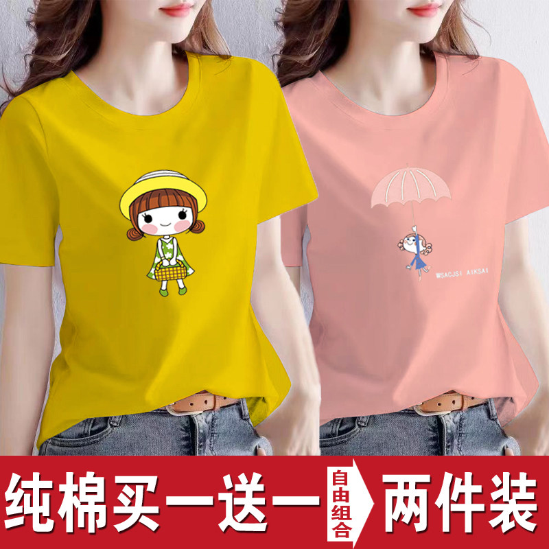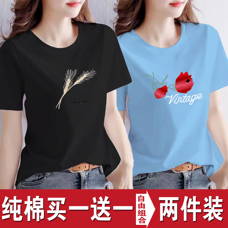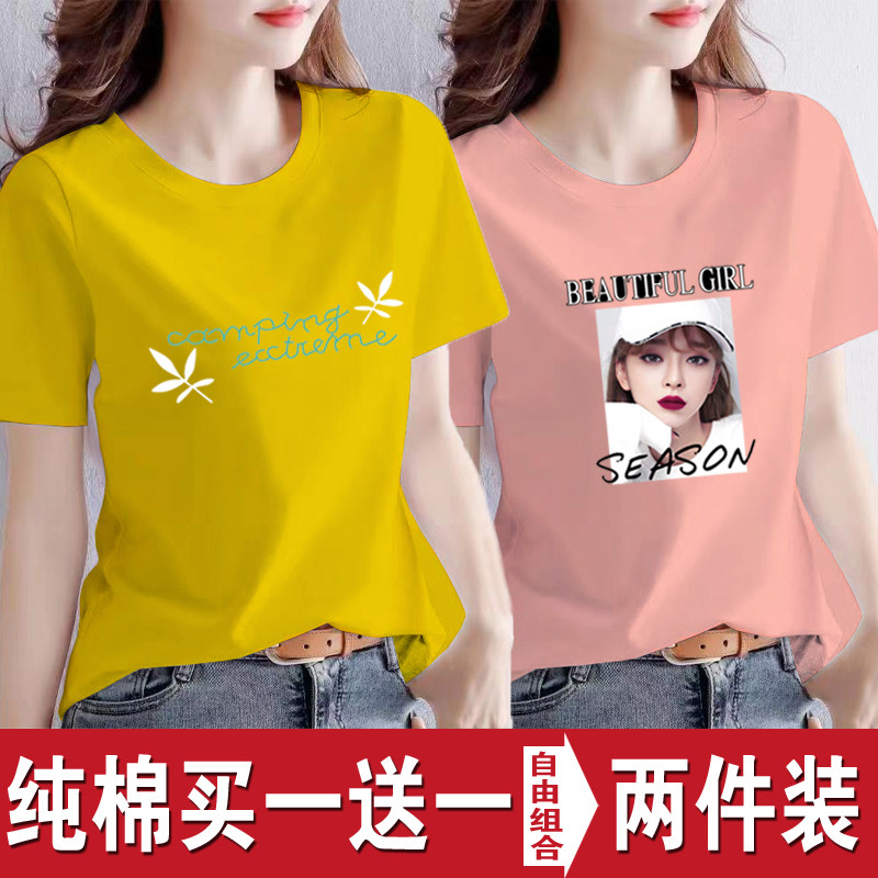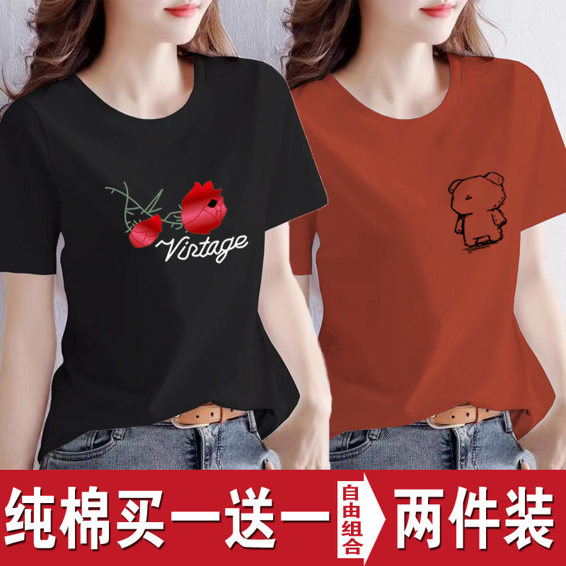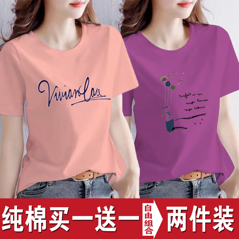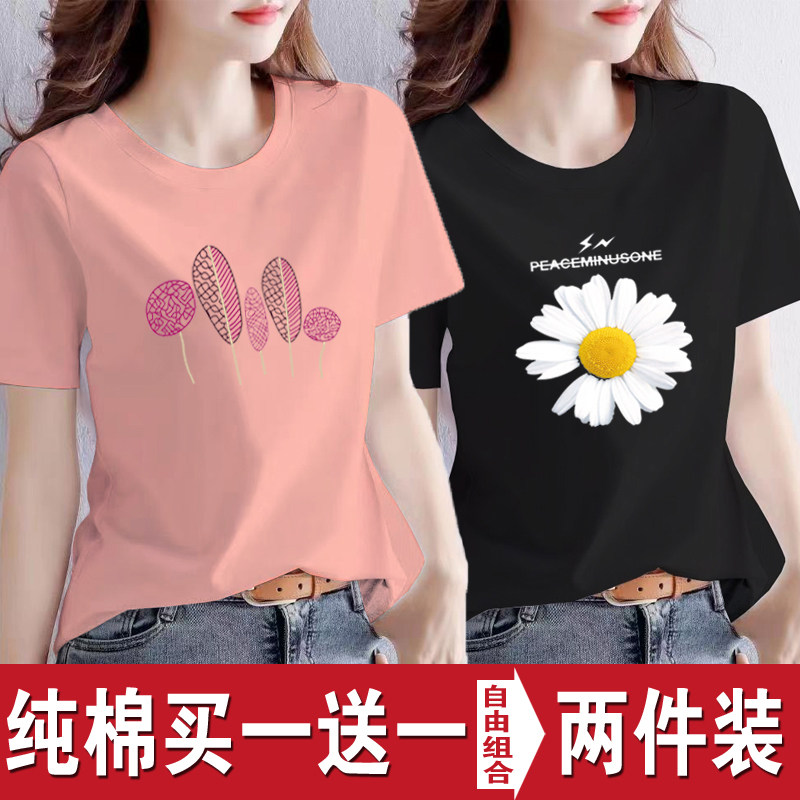 买一送一纯棉韩版印花短袖t恤女时尚宽松潮流时尚大码新款打底衫
