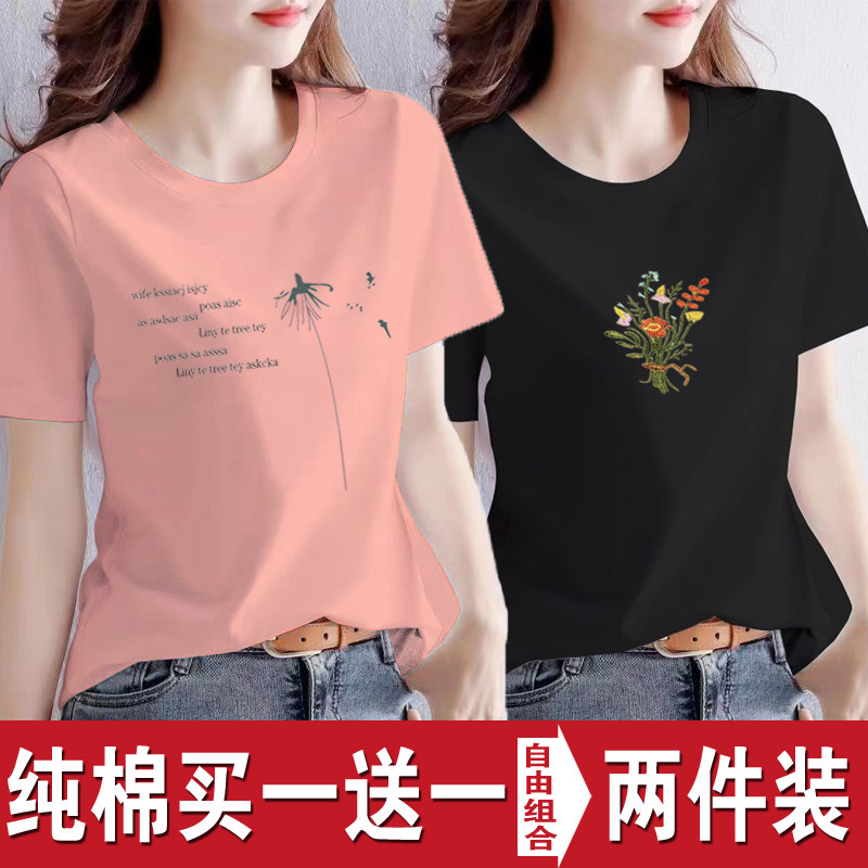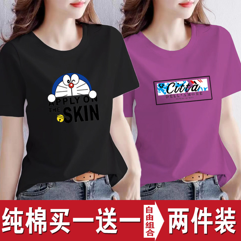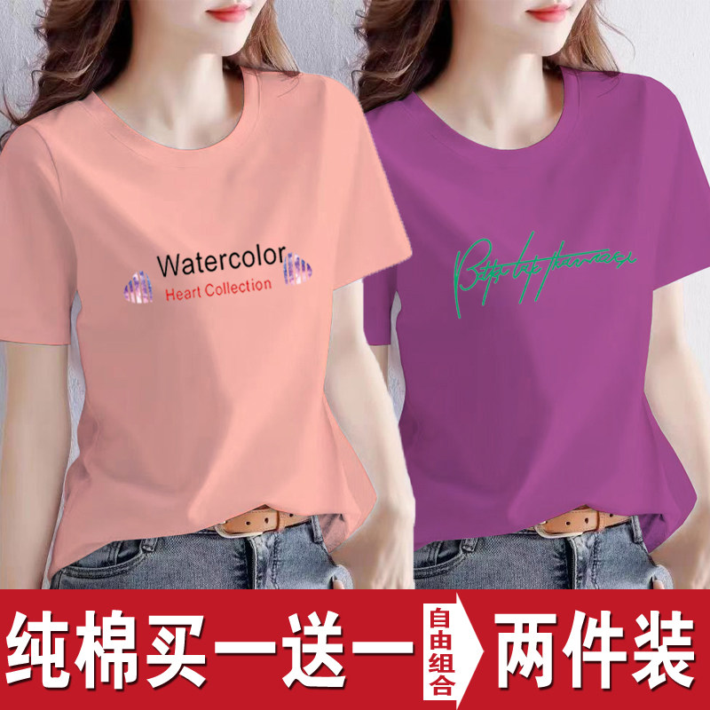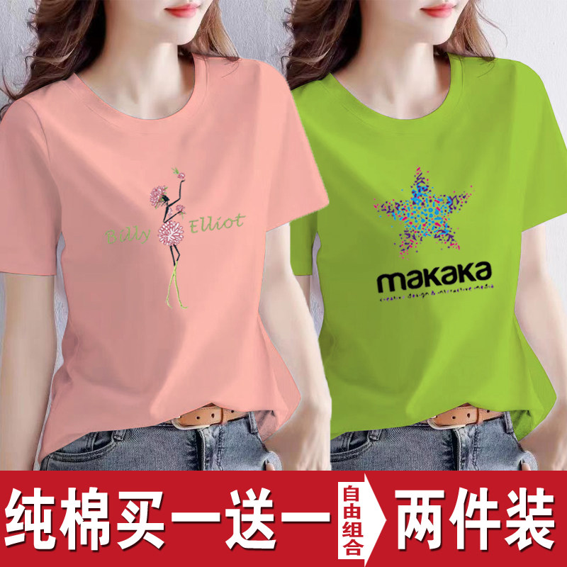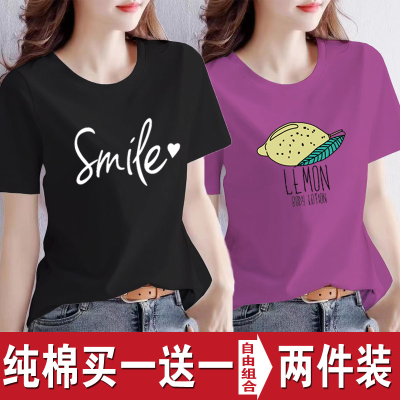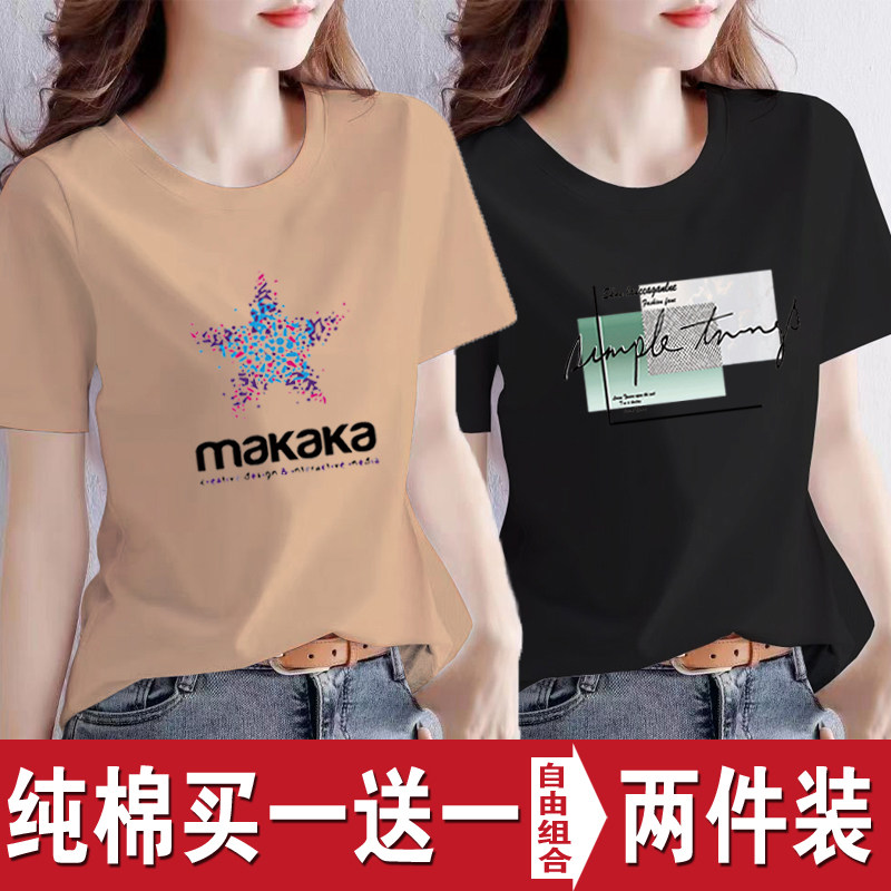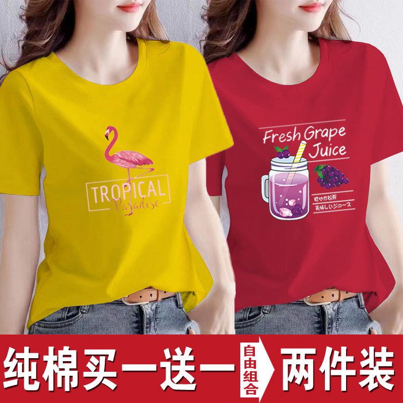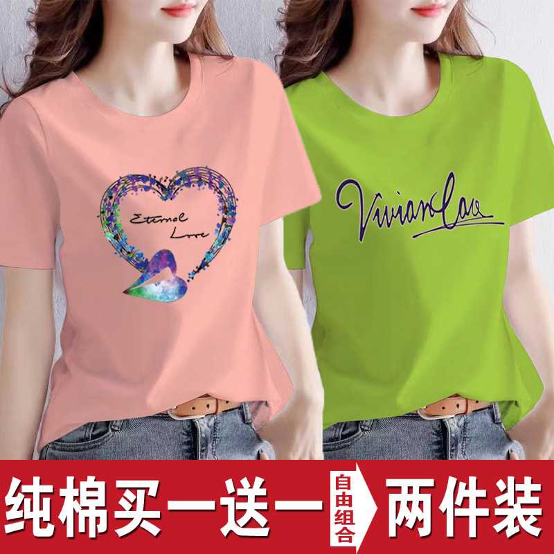 买一送一纯棉韩版印花短袖t恤女时尚宽松潮流时尚大码新款打底衫