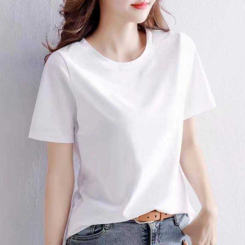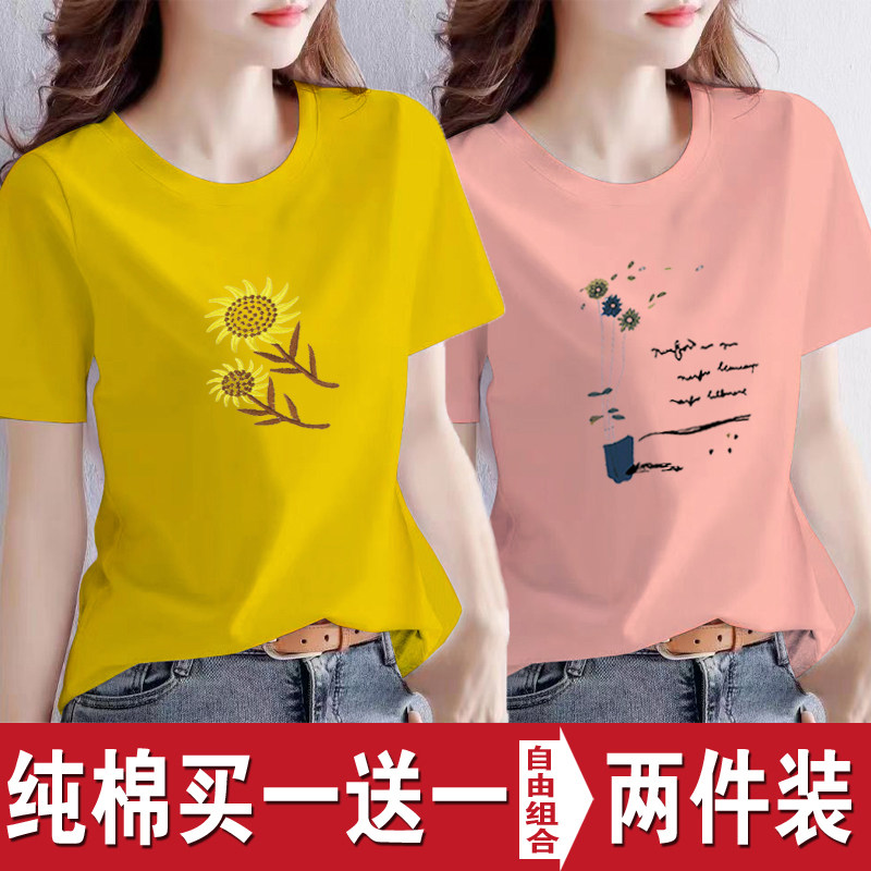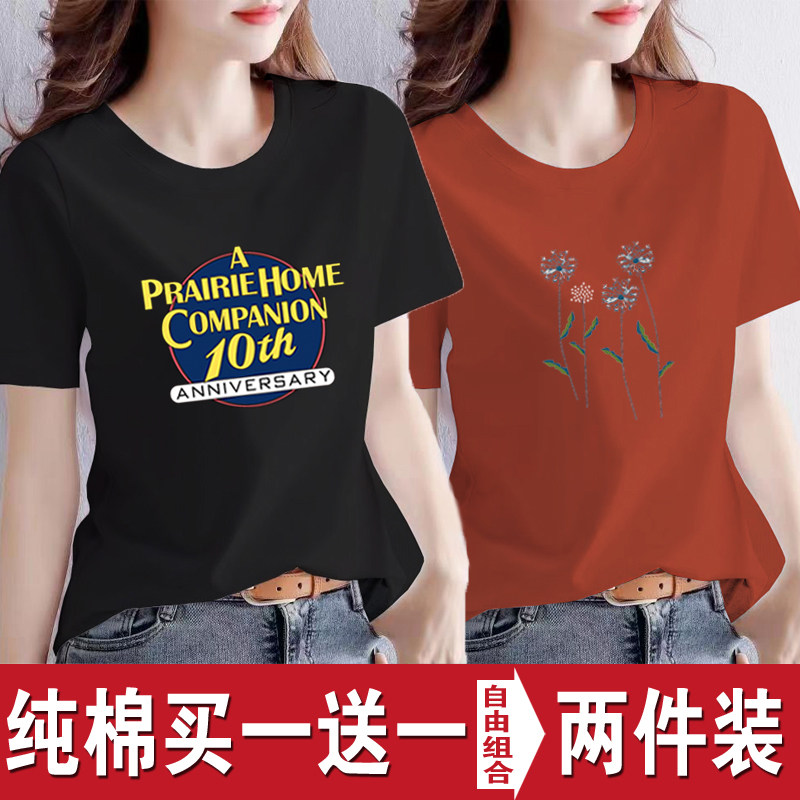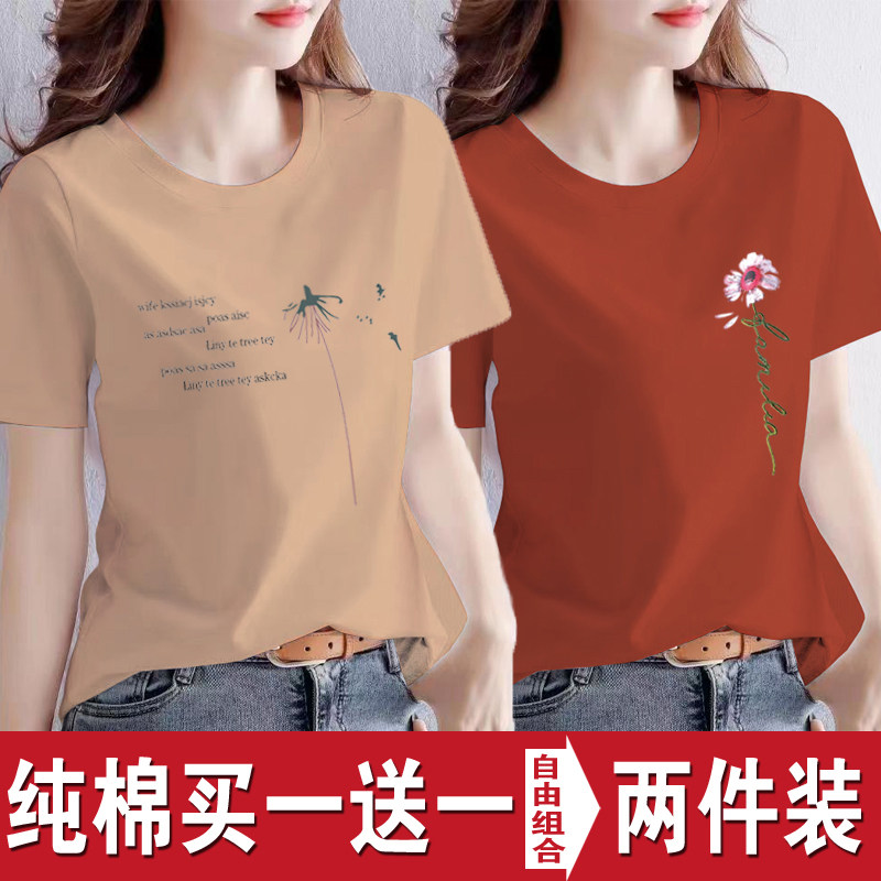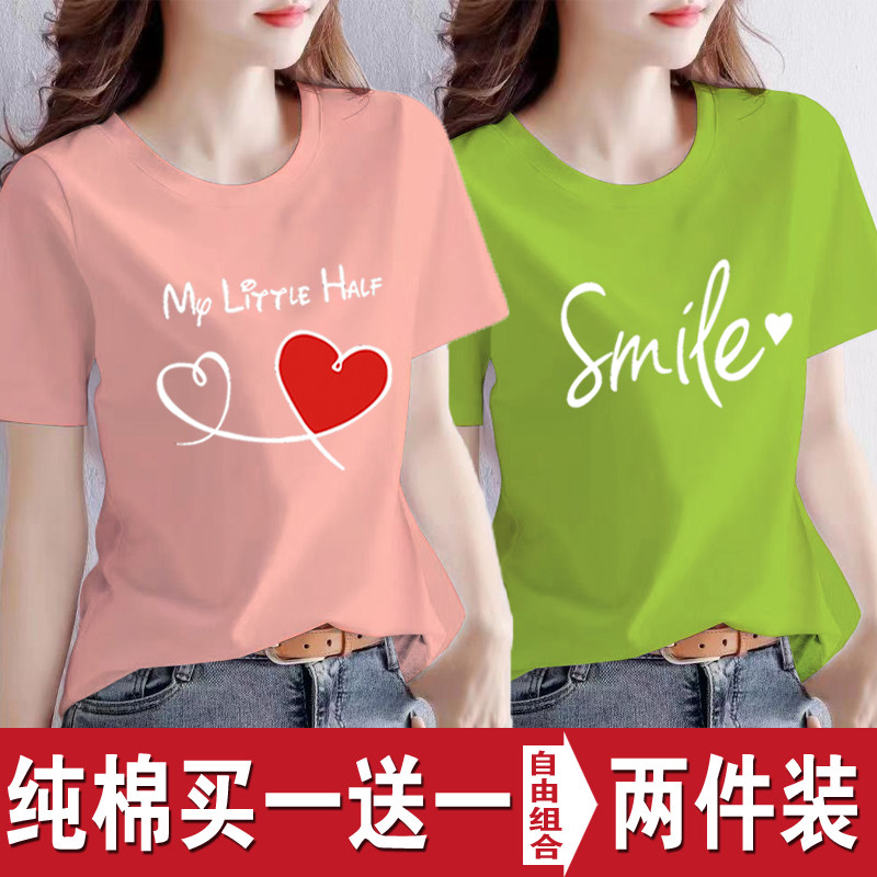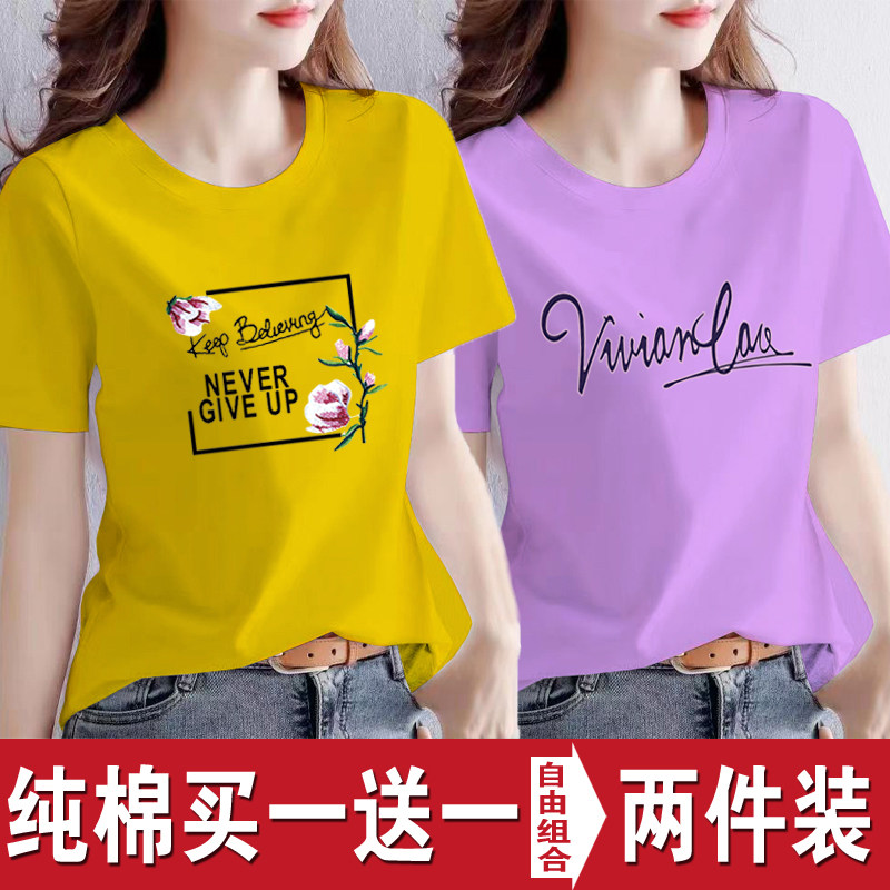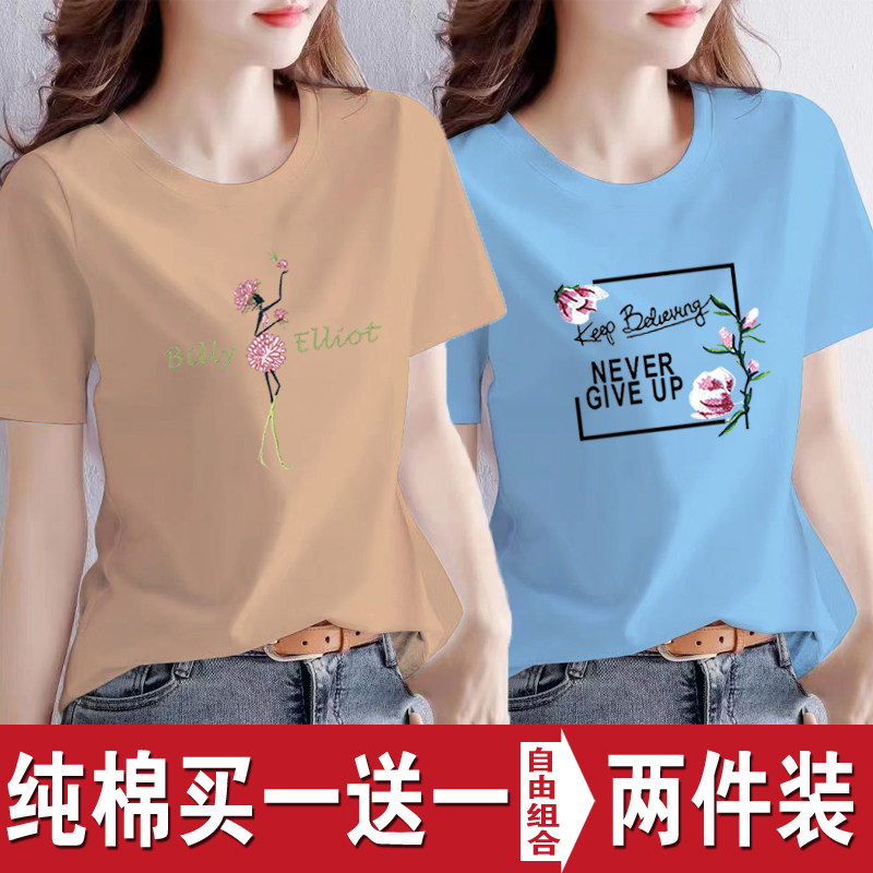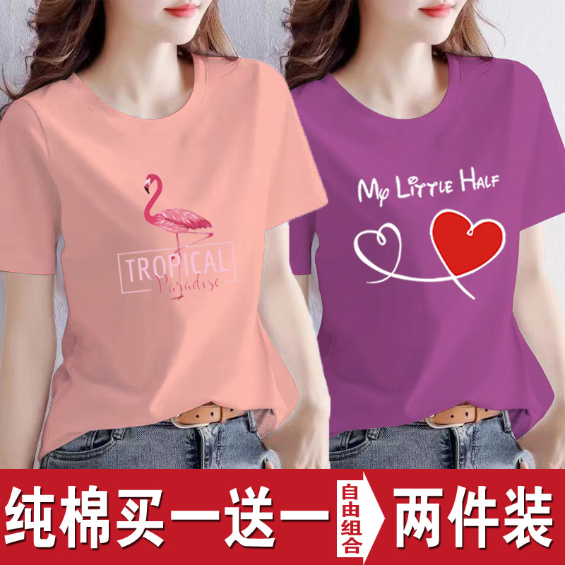 买一送一纯棉韩版印花短袖t恤女时尚宽松潮流时尚大码新款打底衫