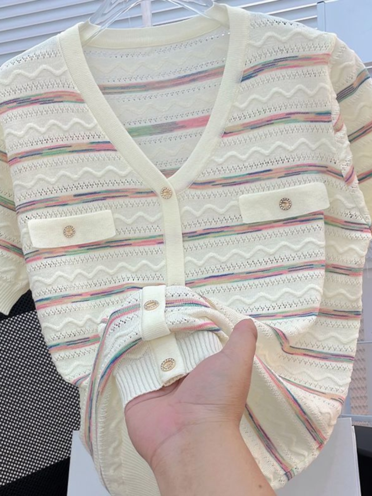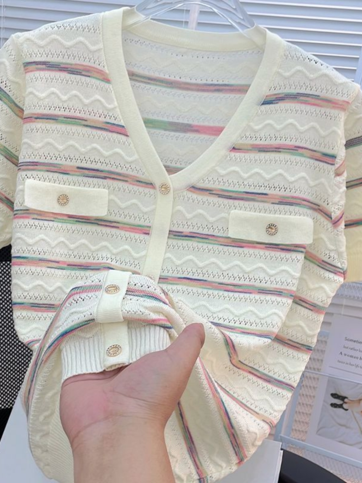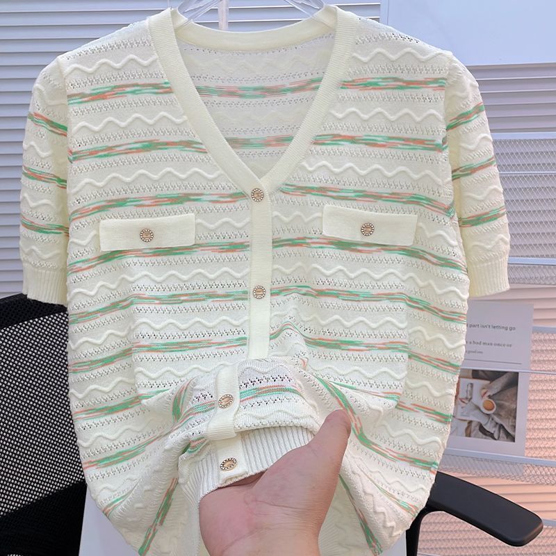 2025新款夏季渐变色法式小香风条纹冰丝针织衫女士V领短袖薄款t恤
