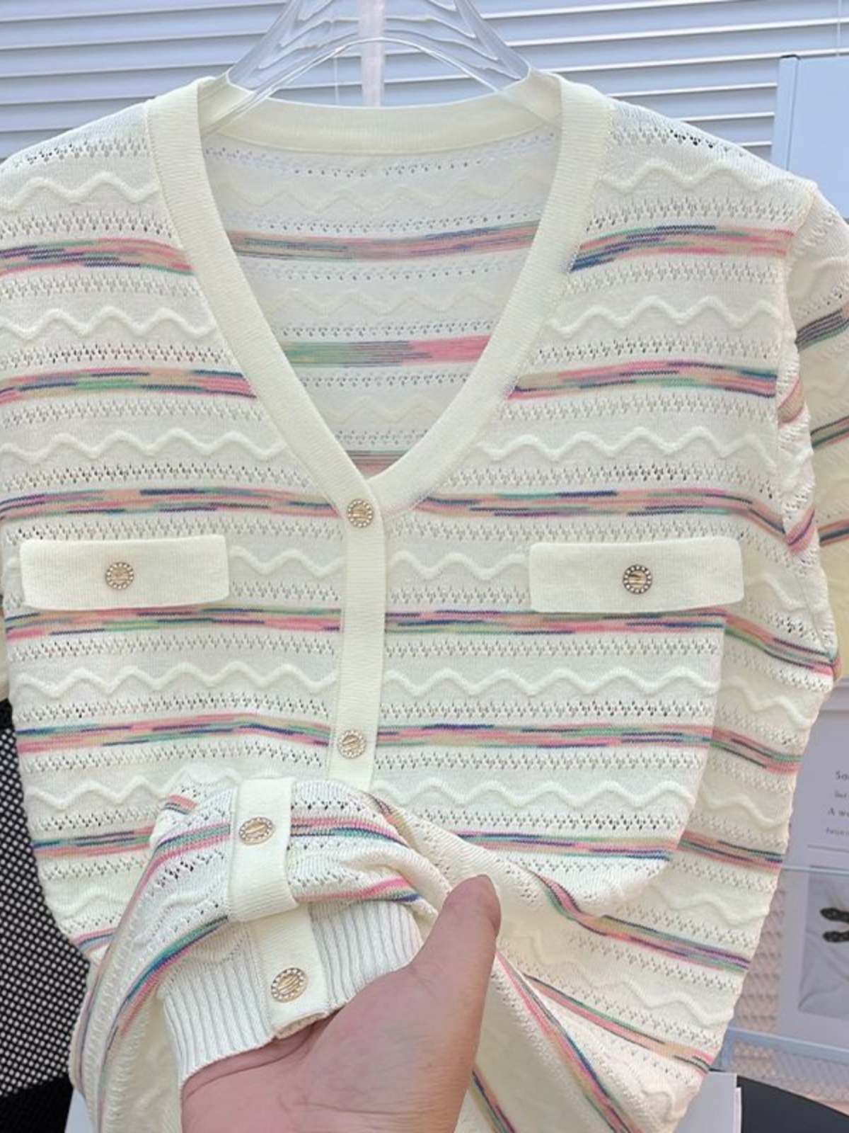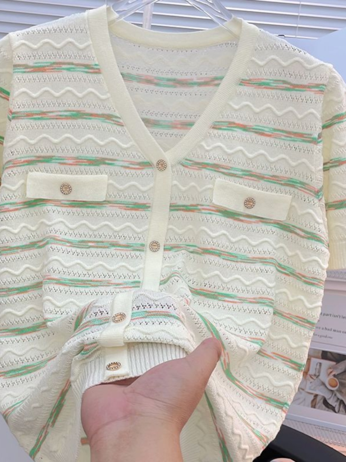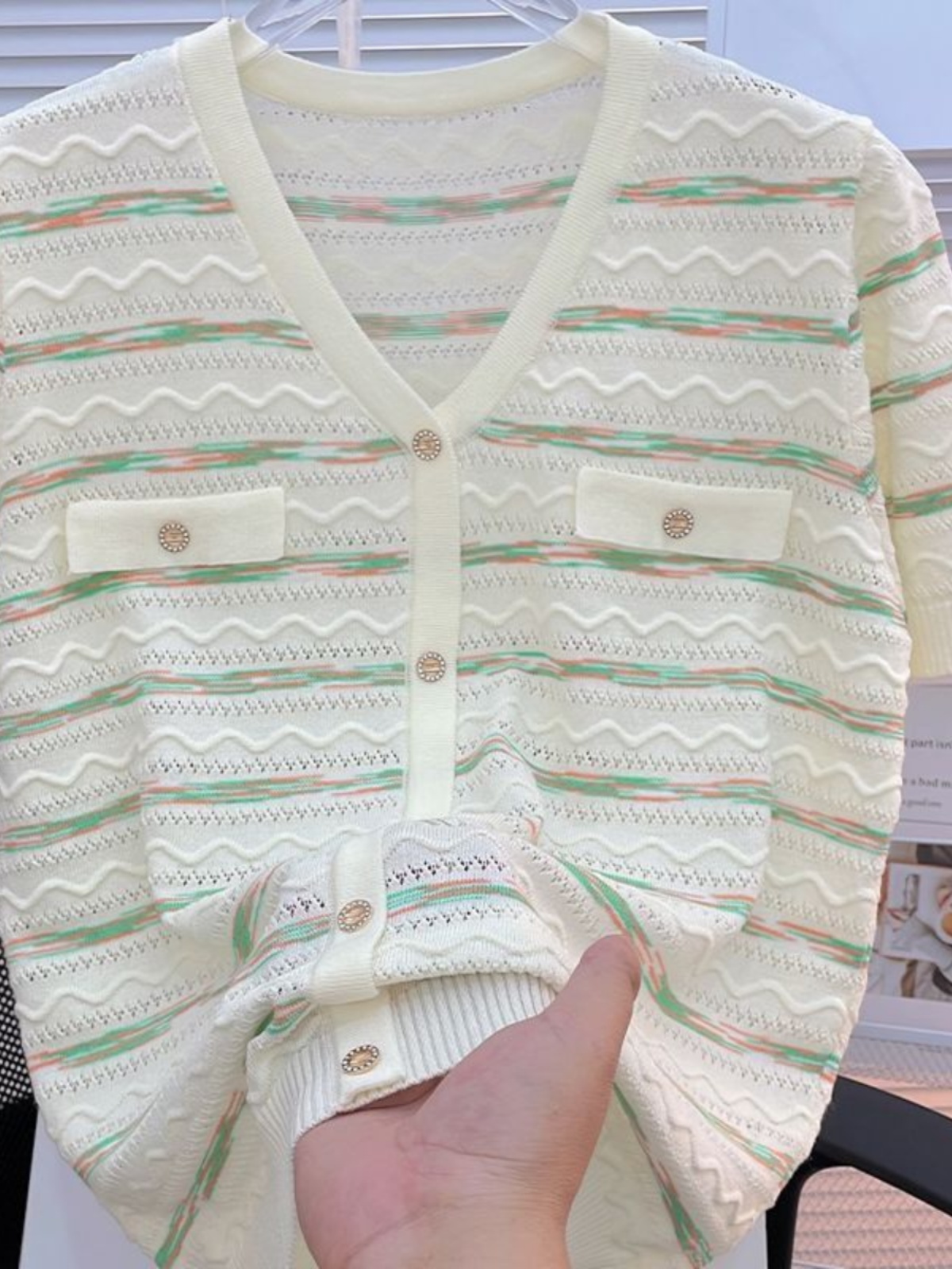 2025新款夏季渐变色法式小香风条纹冰丝针织衫女士V领短袖薄款t恤