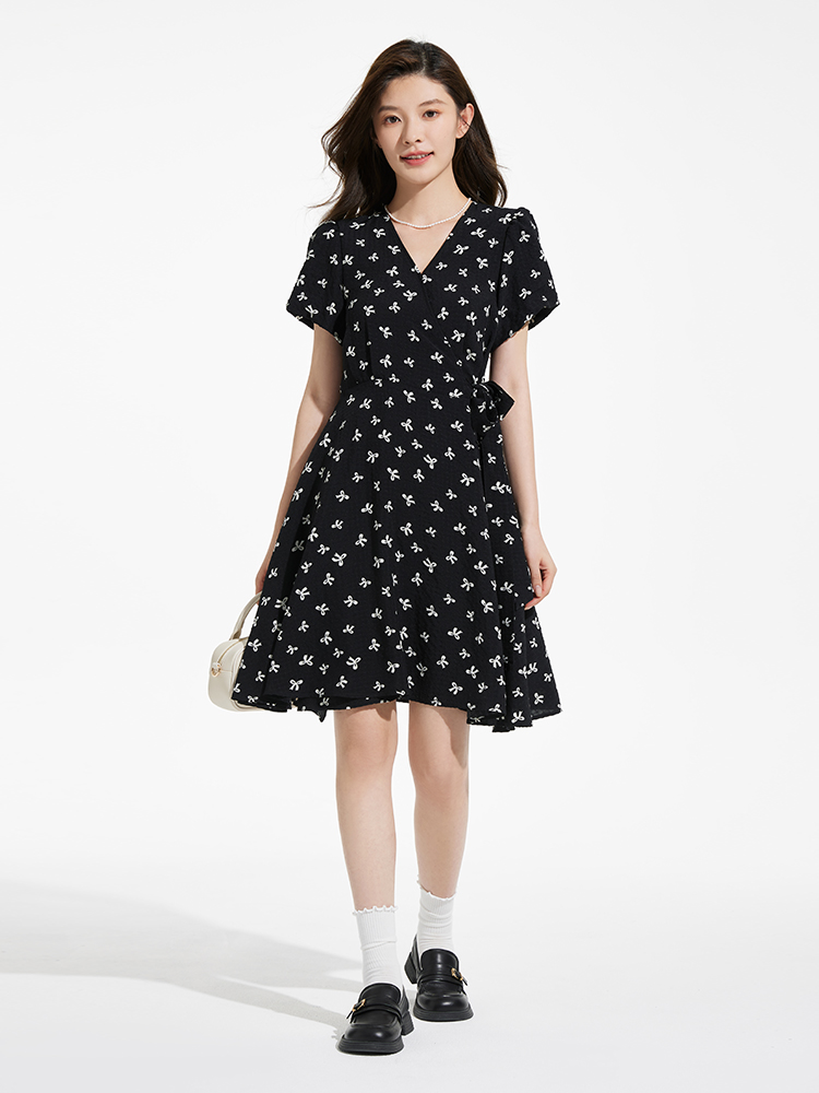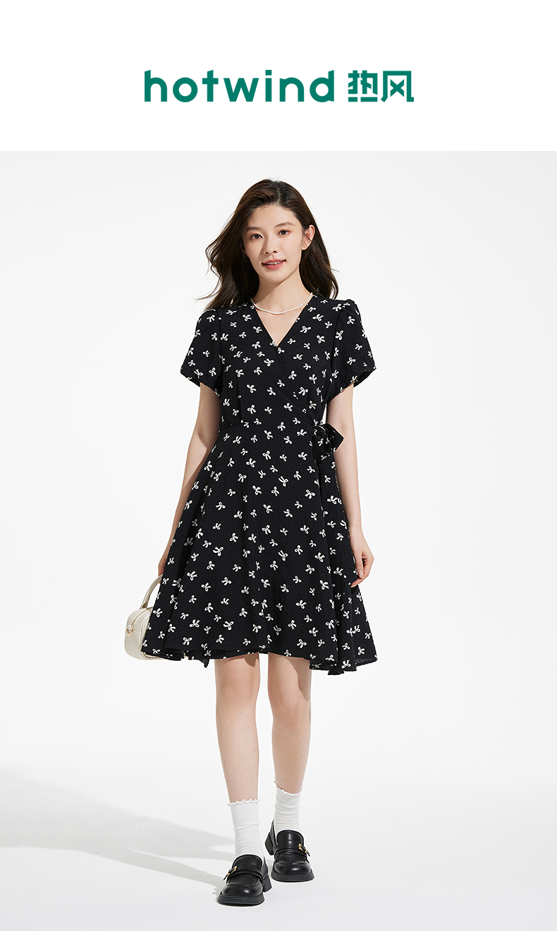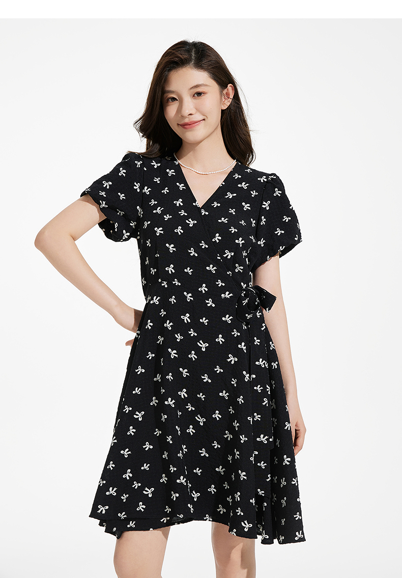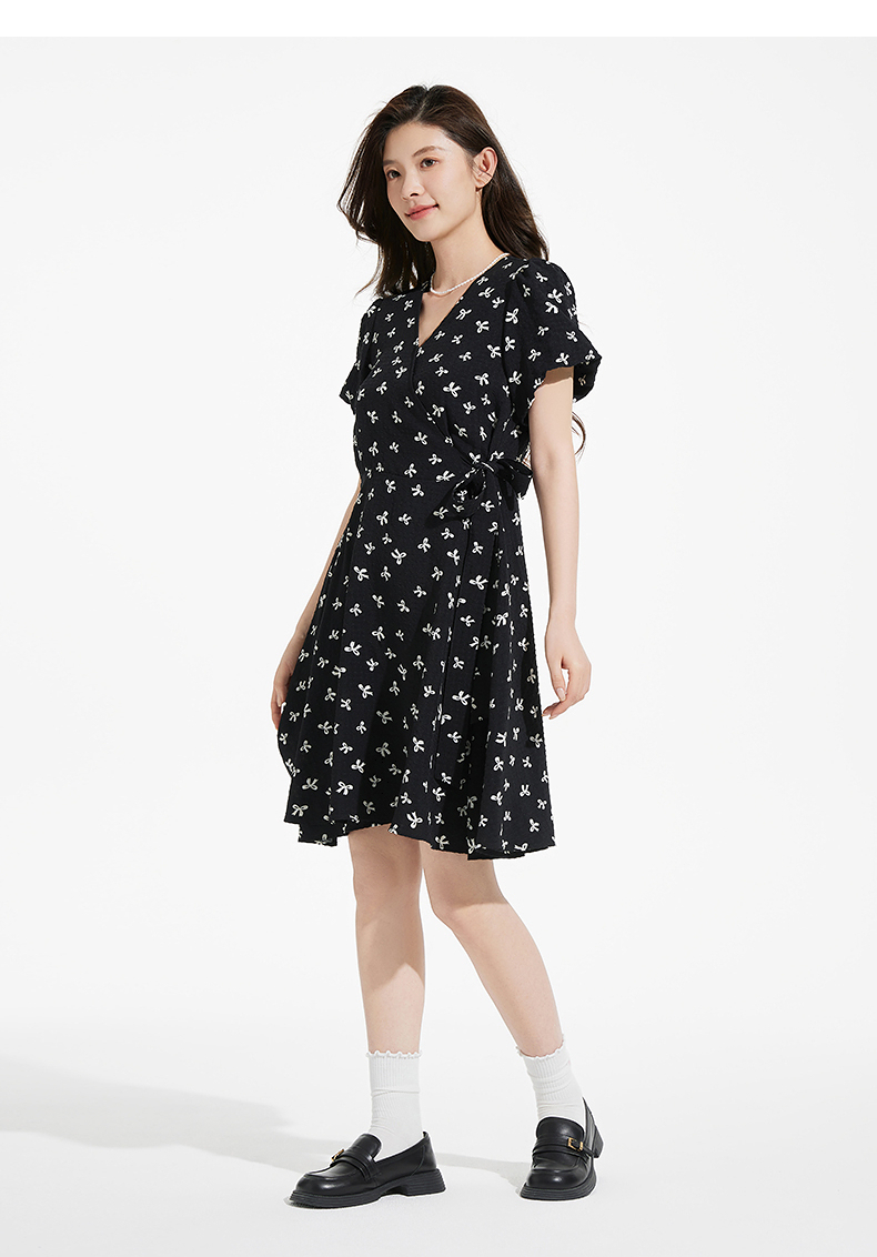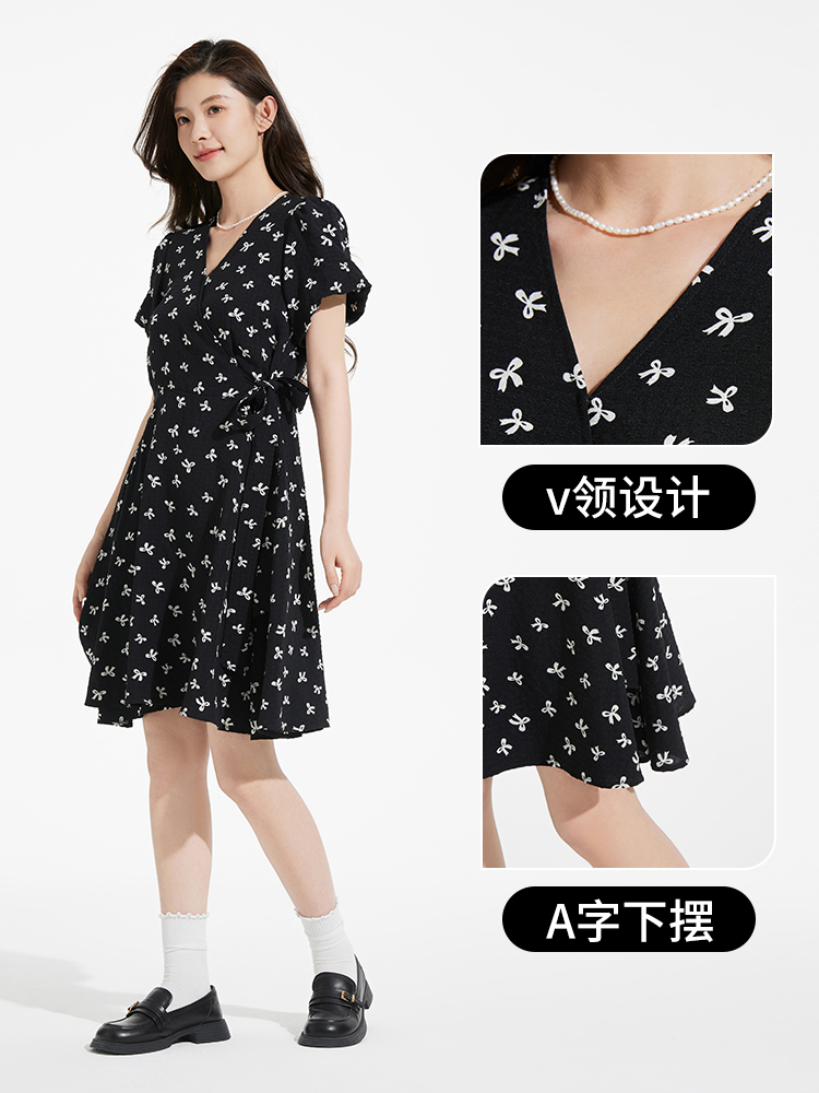 热风黑色碎花连衣裙2025年夏季新款印花围裹连衣裙V领显瘦小黑裙