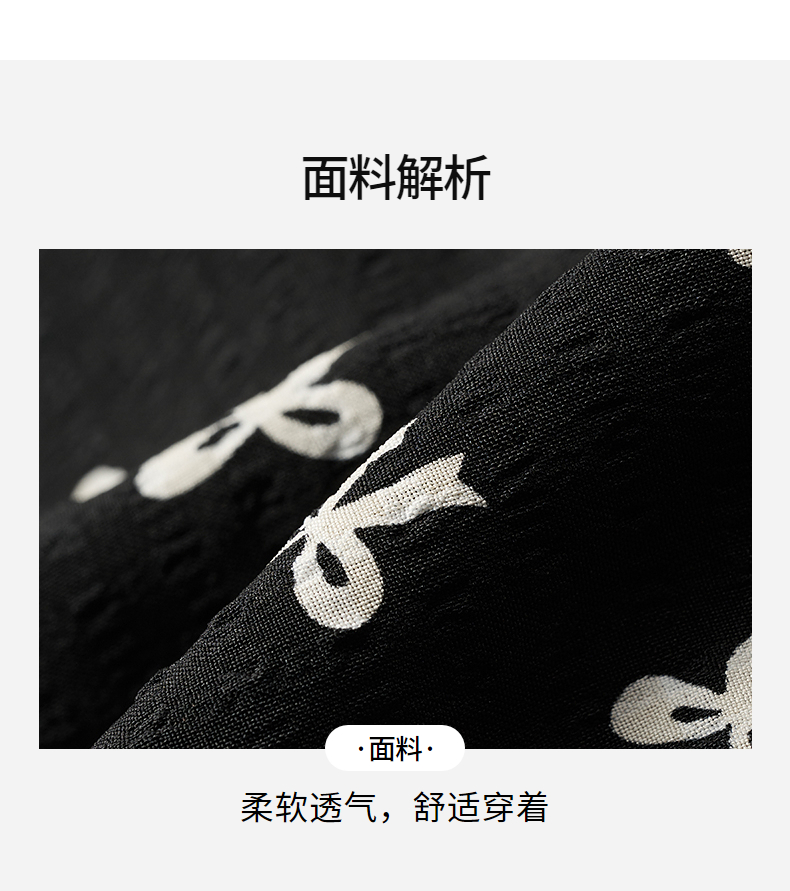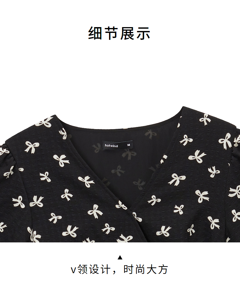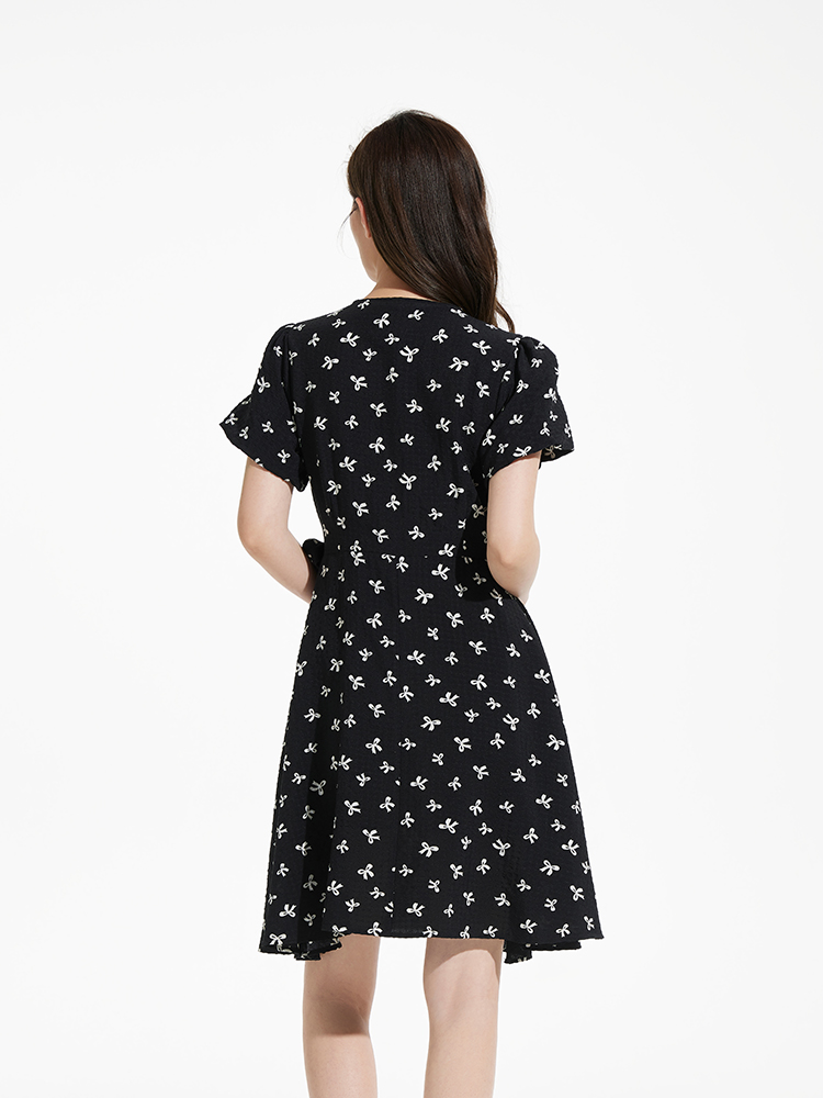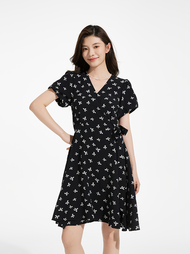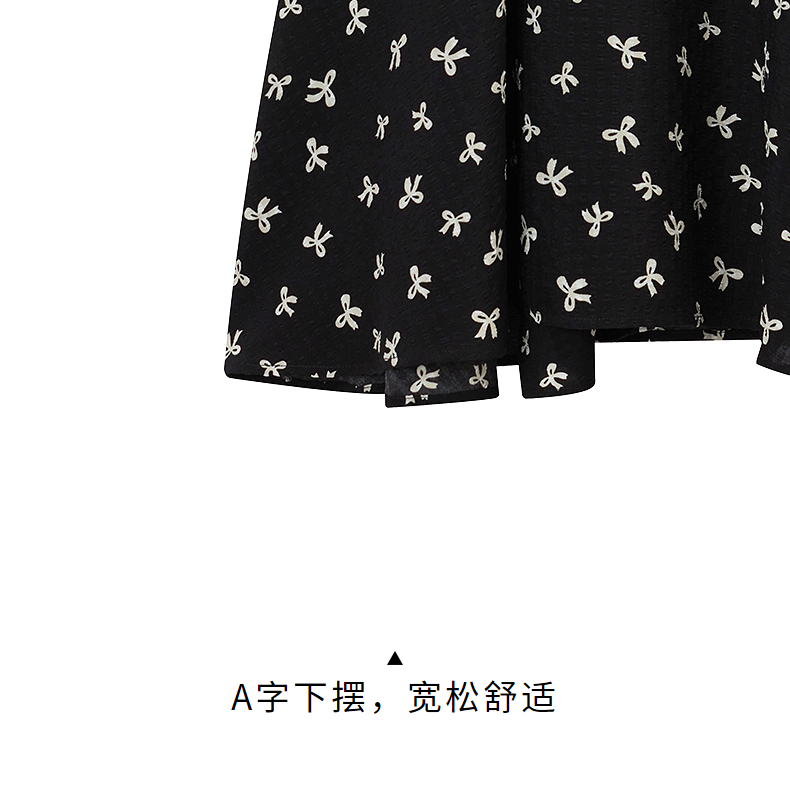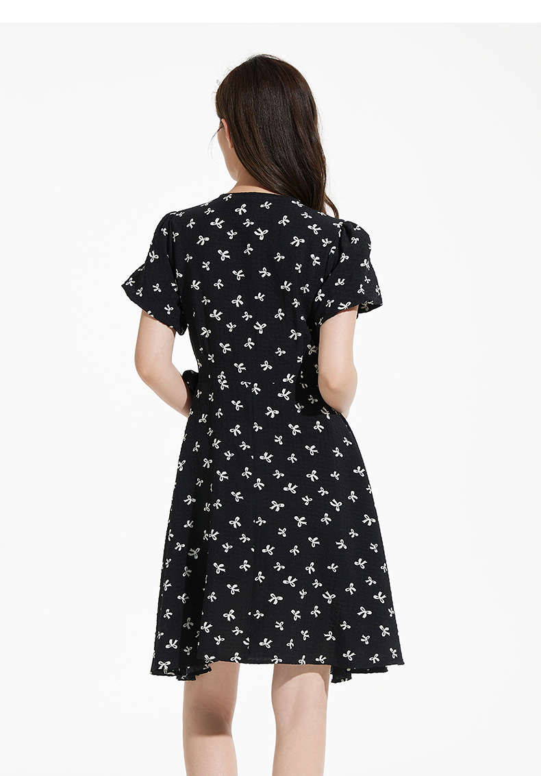 热风黑色碎花连衣裙2025年夏季新款印花围裹连衣裙V领显瘦小黑裙